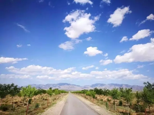 从生态基地的大门口通往公路的林荫道,远方蓝色的山脉就是贺兰山