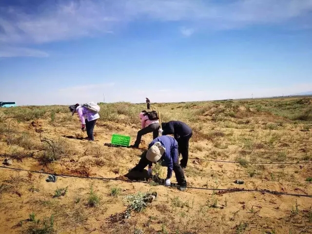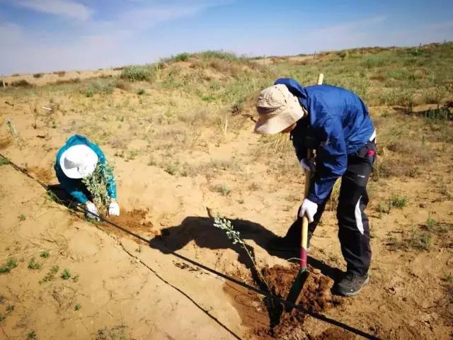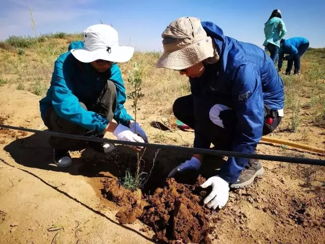 同学们和家长们在锁边林的边缘开始植树,沿着滴灌的水管进行。有的同学负责在每一个滴灌的出水口旁边挖坑,有的两人一组抬着整筐树苗,在每一个树坑旁放下一棵树苗,其余的同学们负责栽种。先将树苗根部包裹的容器育苗用的塑料杯拆掉,将树苗植入后,再将树苗根部的沙土用脚踩实。