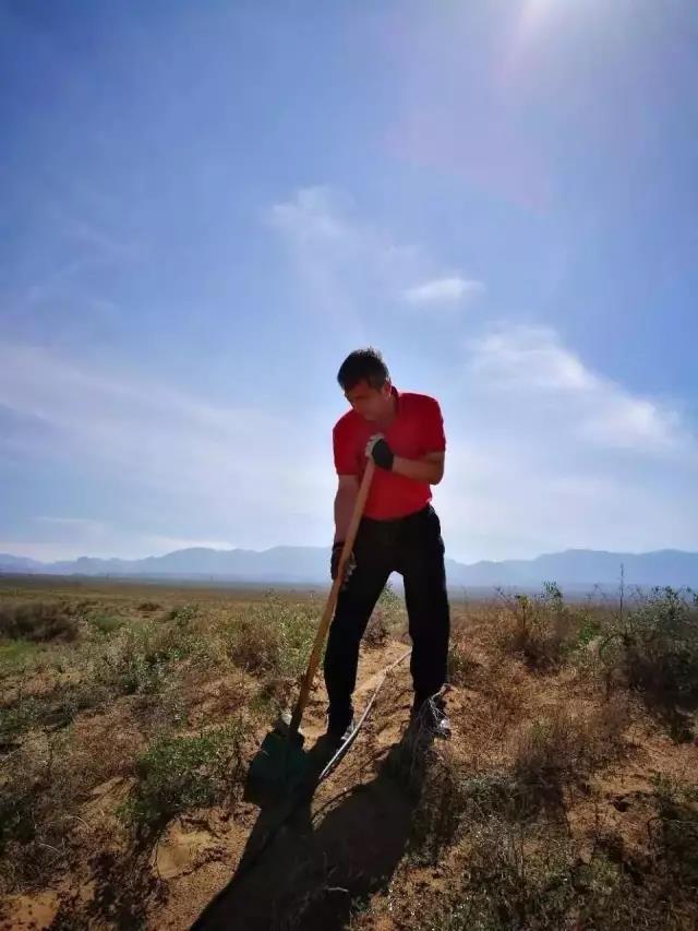 我们将柠条树苗运到基地二号灌溉井旁的植树地段,在去年我们广州植树团队的植树地段进行补种和新区域的种植。