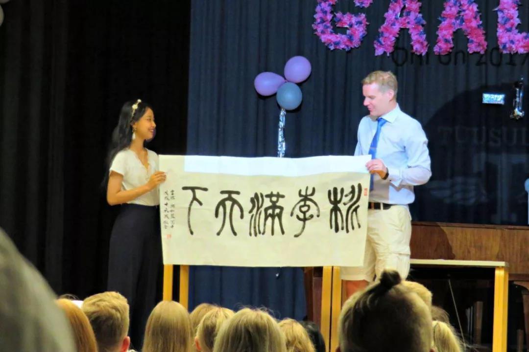 It's not a year in life but life in a year。(不是在一生中体验一年,而是在一年中体验生活。)交换生期间,她多次在芬兰高中、初中、小学开设中国书法、汉语、音乐讲座,自觉地肩负起小文化交流大使的职责。她参演的芬兰语音乐剧还登上了芬兰国家大剧院的舞台。在当地学校举办的年级毕业会上她用流利的芬兰语演讲,并送给校长一幅自己创作的“桃李满天下”篆书横幅,迎来了掌声一片。这样一个女孩,你说应该用什么样的词汇来形容她,“优秀”已然太过单薄。