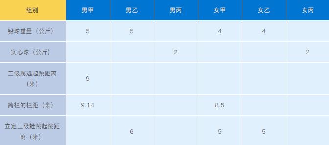 4×100 米接力、4×400 米接力、跳高、跳远、立定三级蛙跳、铅球、垒球掷远