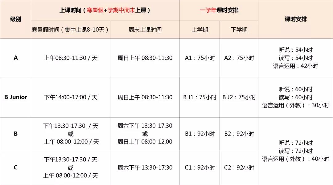 1. 日常面授一学年(A/B Junior级别课程为150小时,B/C级别课程为184小时,含课堂小测)英语听说读写;授课时间分为学期中(周末)及寒暑假集中课程(寒假5-6天,暑假8-10天,视课程完成进度而定),最终安排以开班时发放课表为准;不同级别上课时间安排如下: