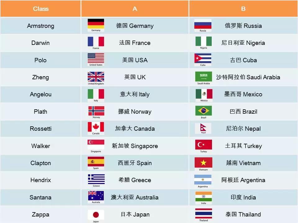 在国家分组上,我们作出了调整。今年继续按经济发展水平及人文地理来分组,并在候选国家名单中新增了尼泊尔。而且非常凑巧地,Armstrong、Darwin和Polo三个班级各自抽中的两个代表国都有一定历史渊源。