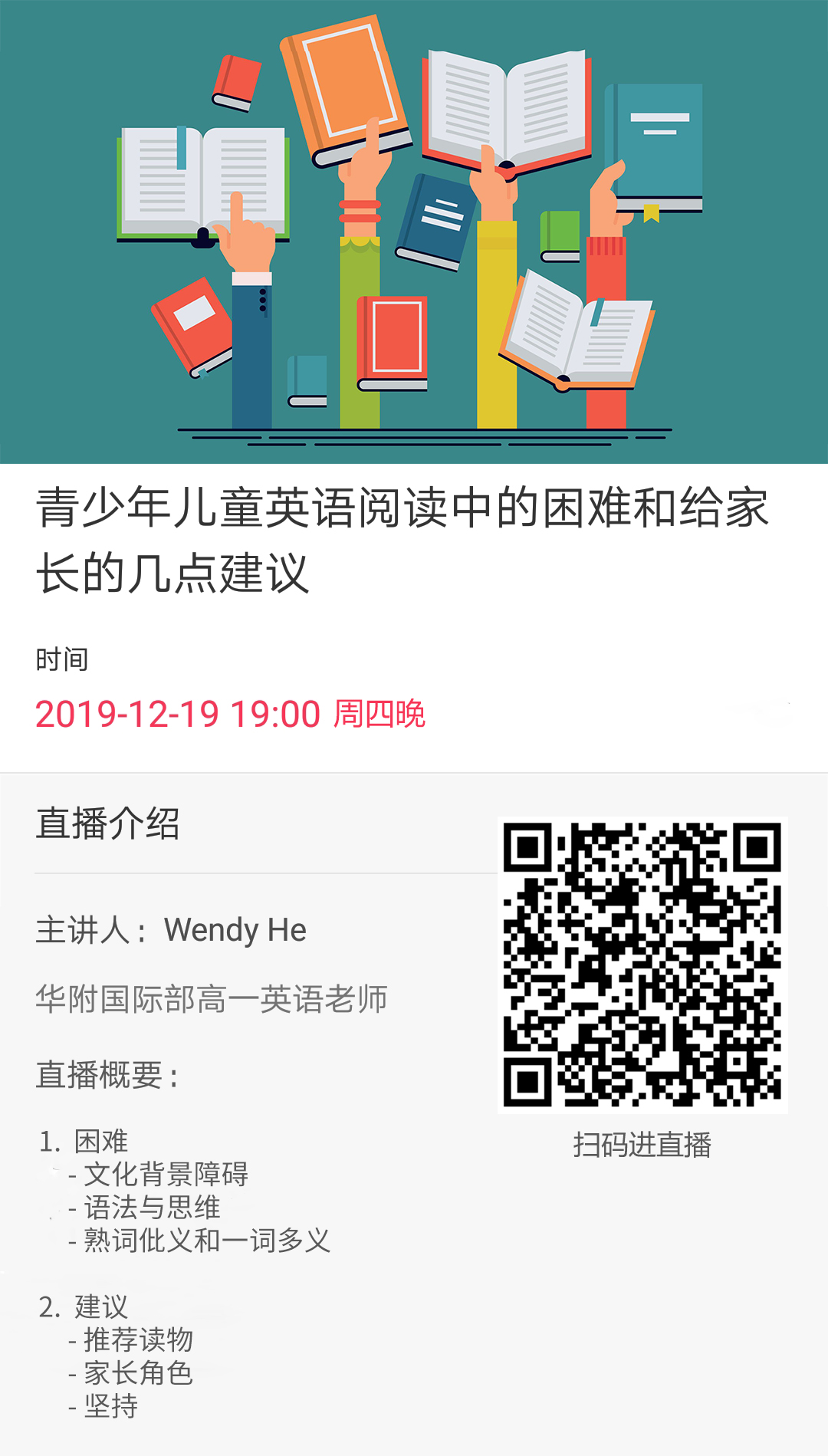 A:不怕,Wendy老师的线上讲座听一听,你会有所收获。12月19日(周四)晚19:00,千聊线上直播主题《青少年儿童英语阅读中的困难和给家长的几点建议》,先扫码报名免费听课吧~
