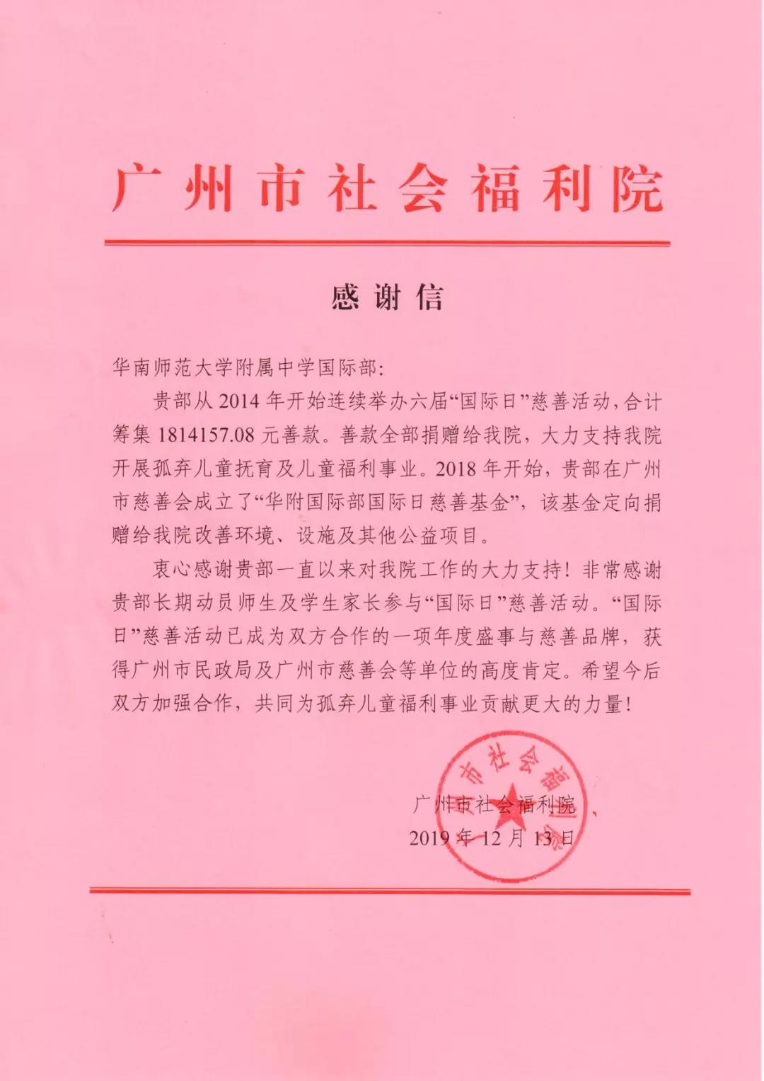 在2019年12月公布的年度广州慈善榜榜单中,华附国际部作为唯一上榜的教育单位(机构),与广东广播电视台电视新闻中心、广州日报、南方都市报、羊城晚报等企事业单位共同入选“2019年度广州慈善影响力榜 · 慈善文化传播影响力榜”。