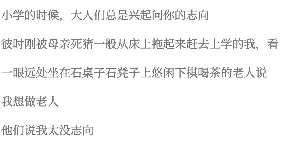 现在回想起来,觉得当年的我这种淡泊名利看淡世事的行为真是胸无大志中带点悠悠佛性,实在是难得,实在是敬佩。又感叹现在的自己尘世中走了十几年胸中志向越来越伟大的行为真是太不像样,太不洒脱,太不符合我人设了。后来我明白了,这多多少少还有一点环境影响的因素在,人确实是会走着走着欲望越来越大。