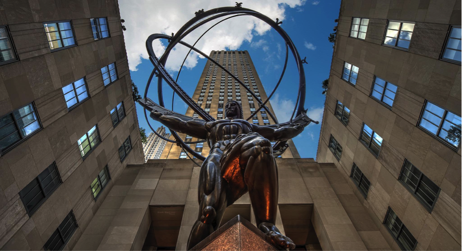 纽约曼哈顿洛克菲勒中心Atlas的雕像。Atlas是希腊神话中用肩膀扛起整个世界的巨人。Atlas Shrugged中作者用这个传说来说明人类文明是由少部分天才所支撑并驱动的——他们就是这个世界的Atlas。