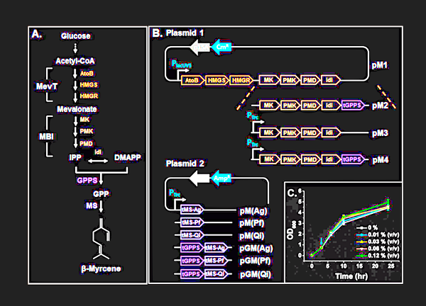 Kim, E. et al. " Microbial Synthesis of Myrcene by Metabolically Engineered Escherichia coli." Journal of Agricultural and Food Chemistry, 2015.