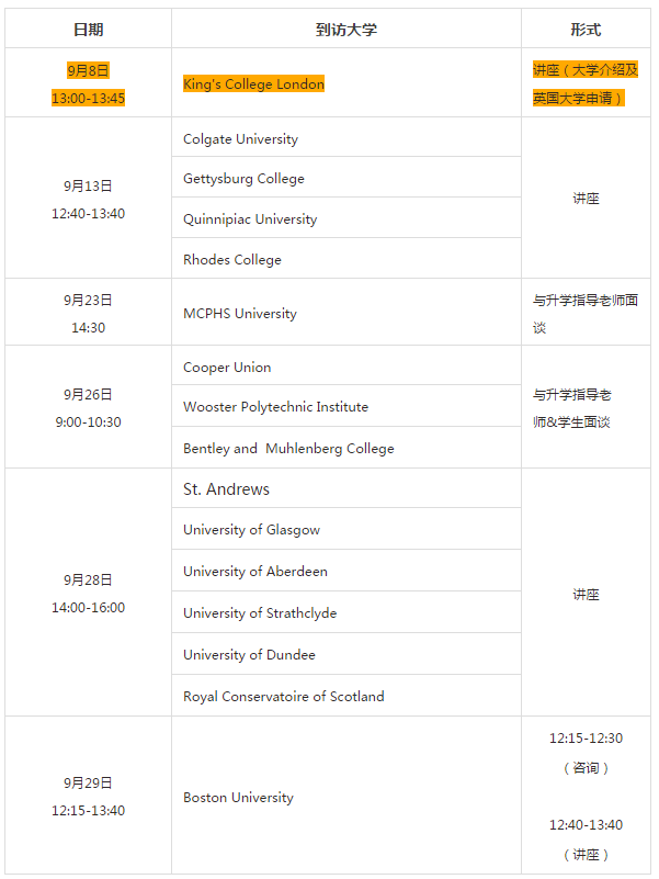 * 将于9月8日(后天)到访的King's College London(伦敦国王学院)是伦敦大学创校学院之一,仅次于牛津、剑桥和伦敦大学学院,是英格兰第四古老的高等教育机构,为英国著名的“金三角名校”一员。有兴趣的同学请提前做好准备!