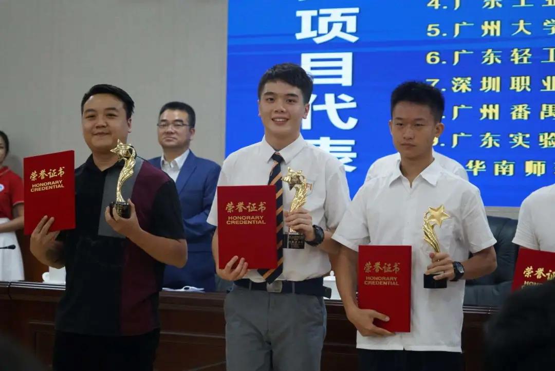 这是继在5月复赛中包揽了广东省青少年科技创新大赛一等奖、广东省科协主席奖(全省仅五名)和专利申请奖三项大奖后,宇骞再次为校捧回奖项!华附本部及国际部首次参加此类赛事并获得佳绩,受到教育厅和组委会有关领导的好评。吴青副校长等学校领导及张宇骞同学一同前往颁奖典礼接受了颁奖。