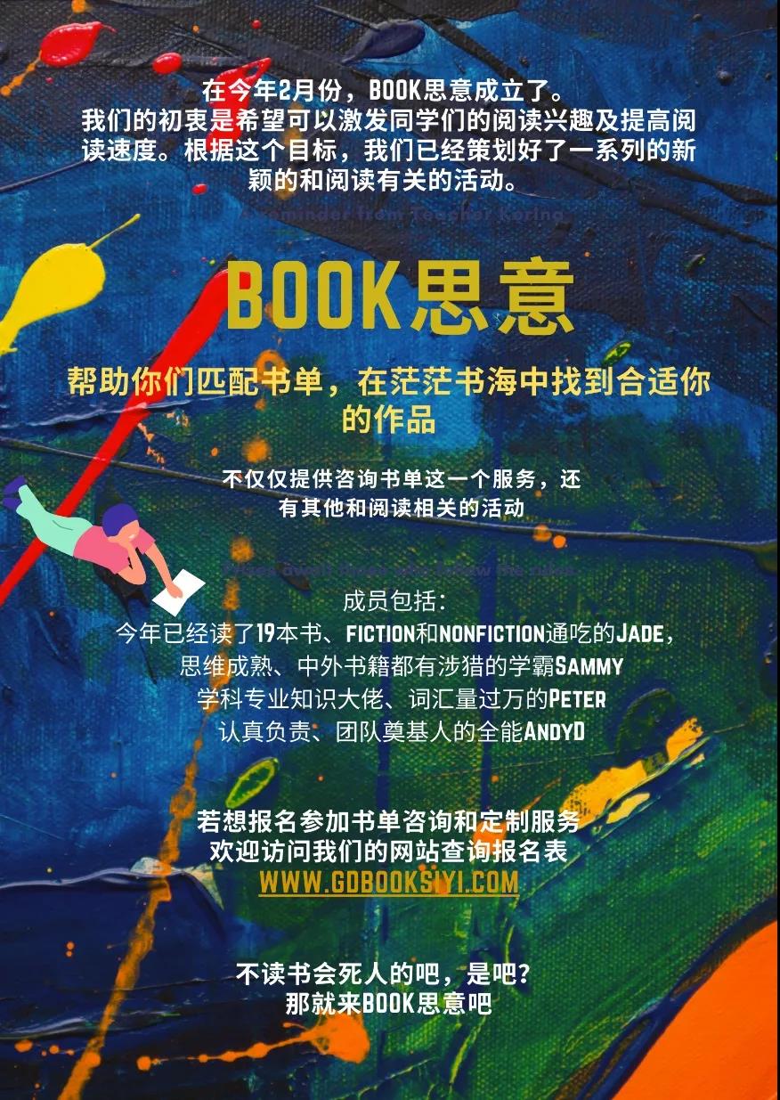 在过去的六个月中,BOOK思意小组收到了同学们的关注和老师们的支持,也有越来越多的朋友加入到这个小社区中。我们希望通过搭建这样一个“阅读”平台,大家能在交流互鉴中强化自我对世界的认知,同时提高成绩和语言能力,塑造自己的批判性思维。或许就抽一点点时间关注一下,都会给你带来意想不到的收获。