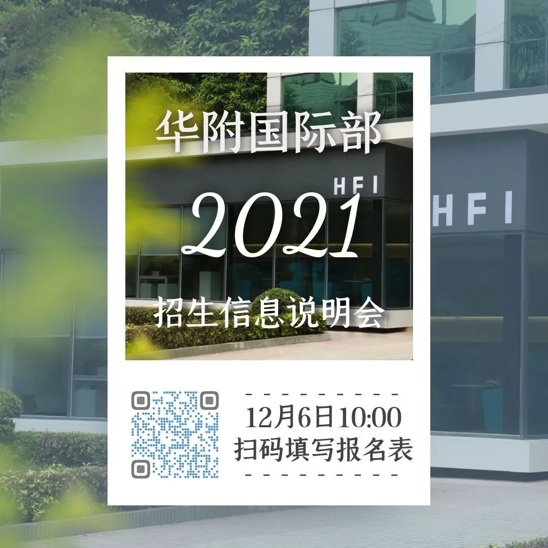华附国际部2021秋季招生信息发布会将于12月6日(周日)10:00-12:00(EAP学术英语课程说明会暨水平测试为14:00-16:10)在校举行。欢迎各位家长/考生扫码报名参加!