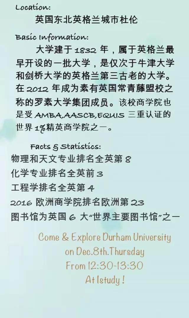明天(周四),英国Durham University杜伦大学数学系教授将为大家介绍杜伦的学习体验及招生标准。