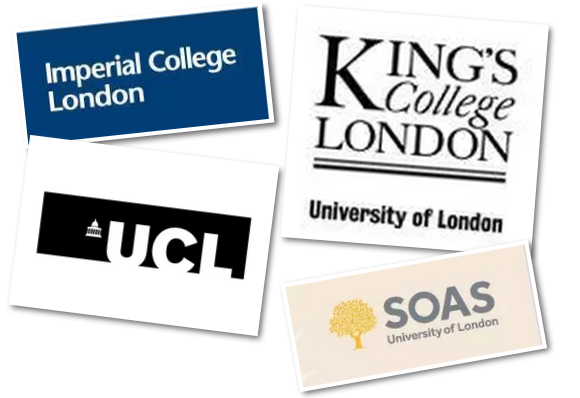 从上到下、左到右依次为:帝国理工学院、伦敦大学国王学院、伦敦大学学院、伦敦大学亚非学院