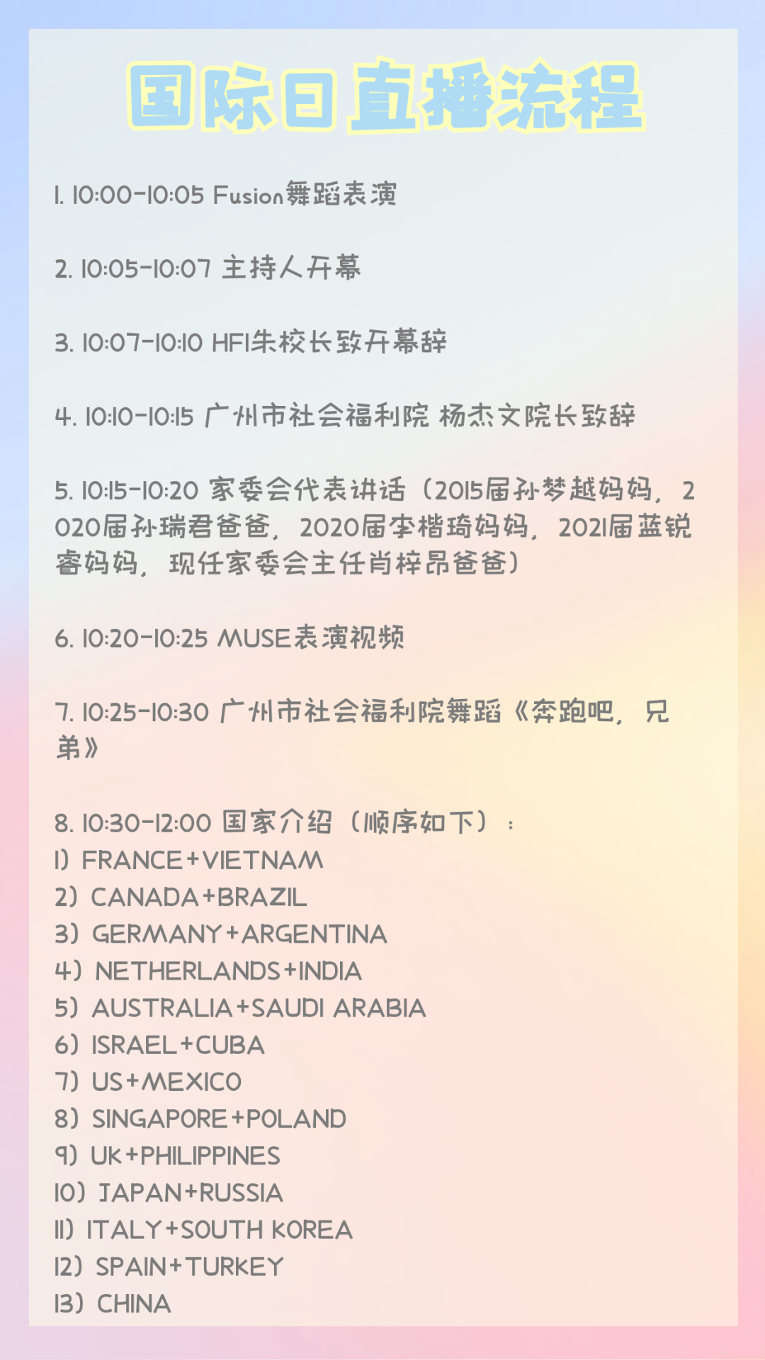 本次活动宗旨就是为广州社会(儿童)福利院献爱心,让HFI的学生参与到为社会做贡献的慈善活动中。希望在学校、家长、学生的共同努力下,做一场纯粹和用心的慈善接力,惠泽大众。欢迎各位家长及校友关注并支持本次国际日线上直播。