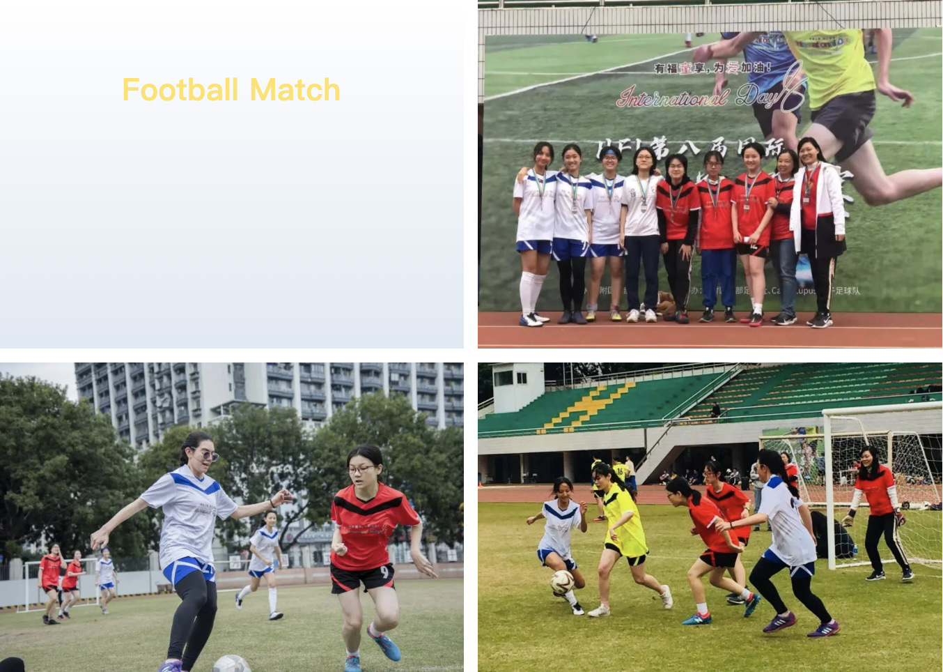 一直有留意国际日足球赛的观众朋友应该知道,上场踢球的多数都是咱们国际部的男生和爸爸们,女生以及妈妈们多数都是志愿者和啦啦队的角色。不过今年有一队女将加入,国际日绿茵上终于有了更多女孩追风踢球的身影。