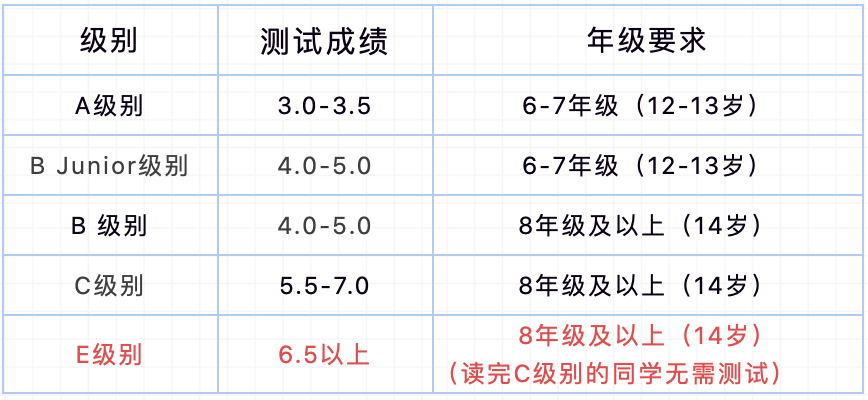 标准及内容:参照欧洲语言教学评估共同纲领Common European Framework of Reference for Languages (CEFR),基于水平测试成绩(含听力、阅读)和学生年级,将学生划分为以下级别: