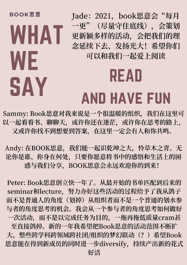 ● BOOK 思意主要由掼蛋官方网站正版四位高二学生和五位高一学生组成。在 2020 年 2 月成立,初衷是帮助他人找到适合的书籍(多为英文书籍),找到合适的读书方法,养成阅读习惯,爱上阅读。初始阶段我们主要做书单定制服务,后期我们举 行了多次大型的阅读讨论活动,并在公众号发表多篇原创文章。暑假 7、8 月, 我们举办了共读活动,和 20 多位同学(指活跃人数)讨论了 4 个热门话题,如body shaming, aesthetic violence, suicide, & fan culture。10 月份,我们组织了第二次活动,为同学们从多方面解读病疫,从生物学的疾病传播,到历史上人类经历的浩劫,还有宗教信仰和病疫。2021 年 1 月和 2 月,我们举办了两个现代主义文学的主题活动,一个针对高中生,一个针对初中生,带超过百名学生阅读了Mrs. Dalloway和Metamorphosis两部经典现代主义作品。2021 剩下的时间,我们想举办影响力更大的活动,找更有趣的话题,用更新颖的形式,让大家喜欢阅读,热爱阅读。