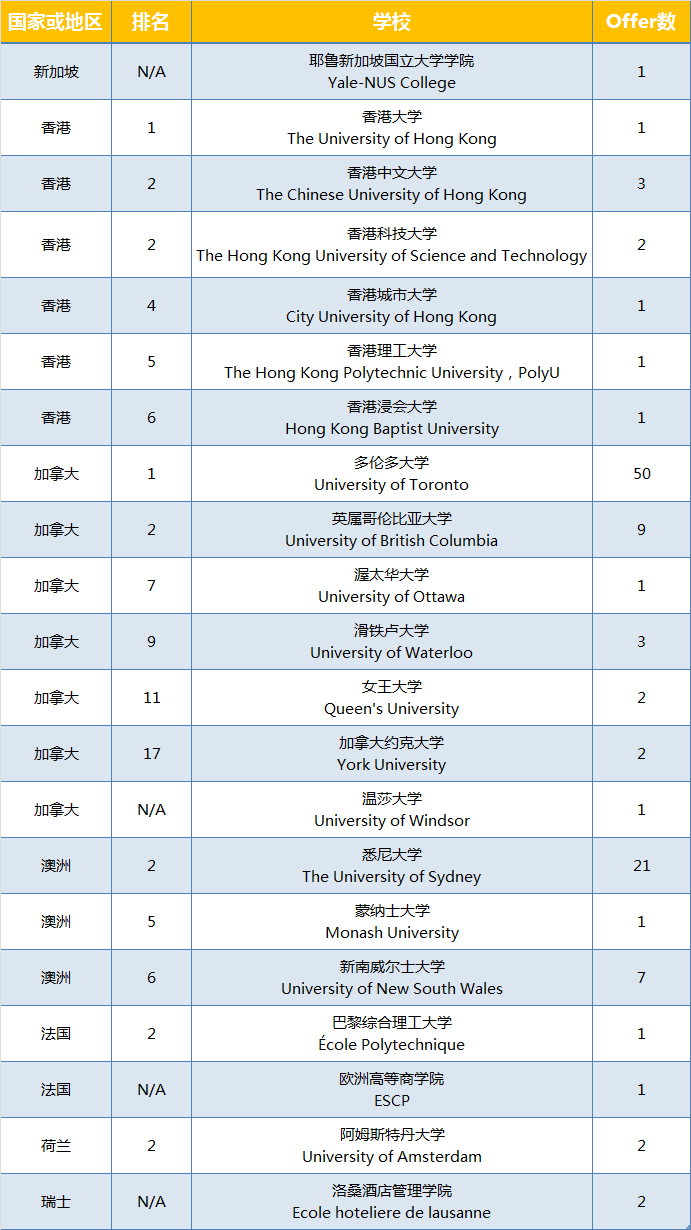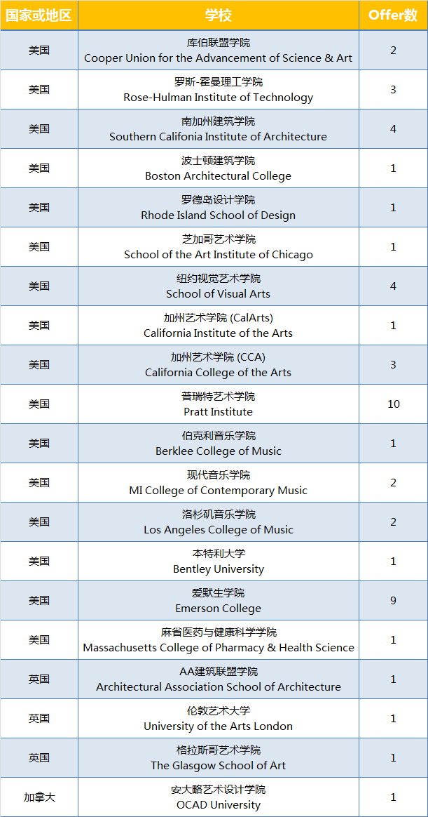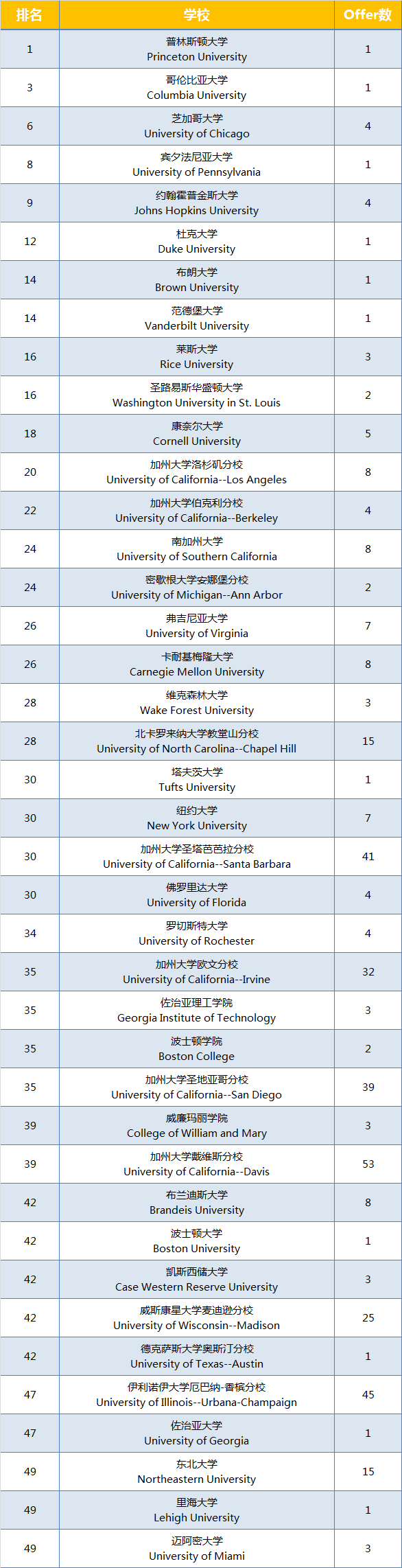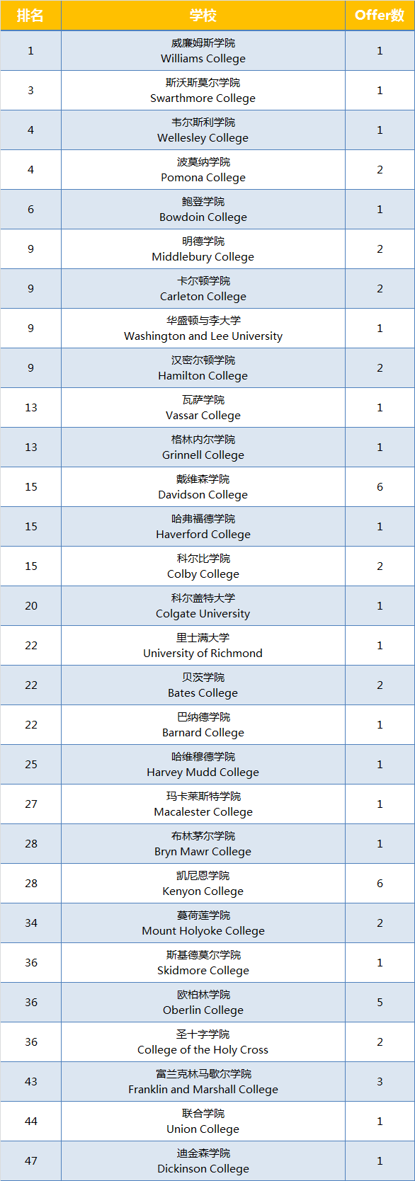 其中,来自美国普林斯顿、宾夕法尼亚大学、哥伦比亚大学、布朗大学、康奈尔大学及Top 10综合性大学录取共17份,美国Top 30综合性大学录取132份;来自美国Top 10文理学院包括威廉姆斯学院、斯沃斯莫尔学院、韦尔斯利学院、波莫纳学院、鲍登学院、明德学院等录取共13份;