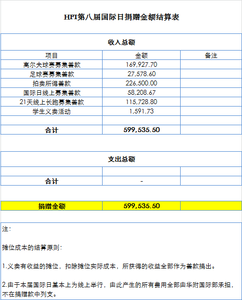 经国际部财务老师、家委会财务代表、家委会主任及广州市儿童福利院代表财务结算及共同审核,第八届华附国际日共筹集善款共计人民币599,535.5元(包括国际日系列活动,线上直播、拍卖、赞助费、个人捐款等收益所得)。