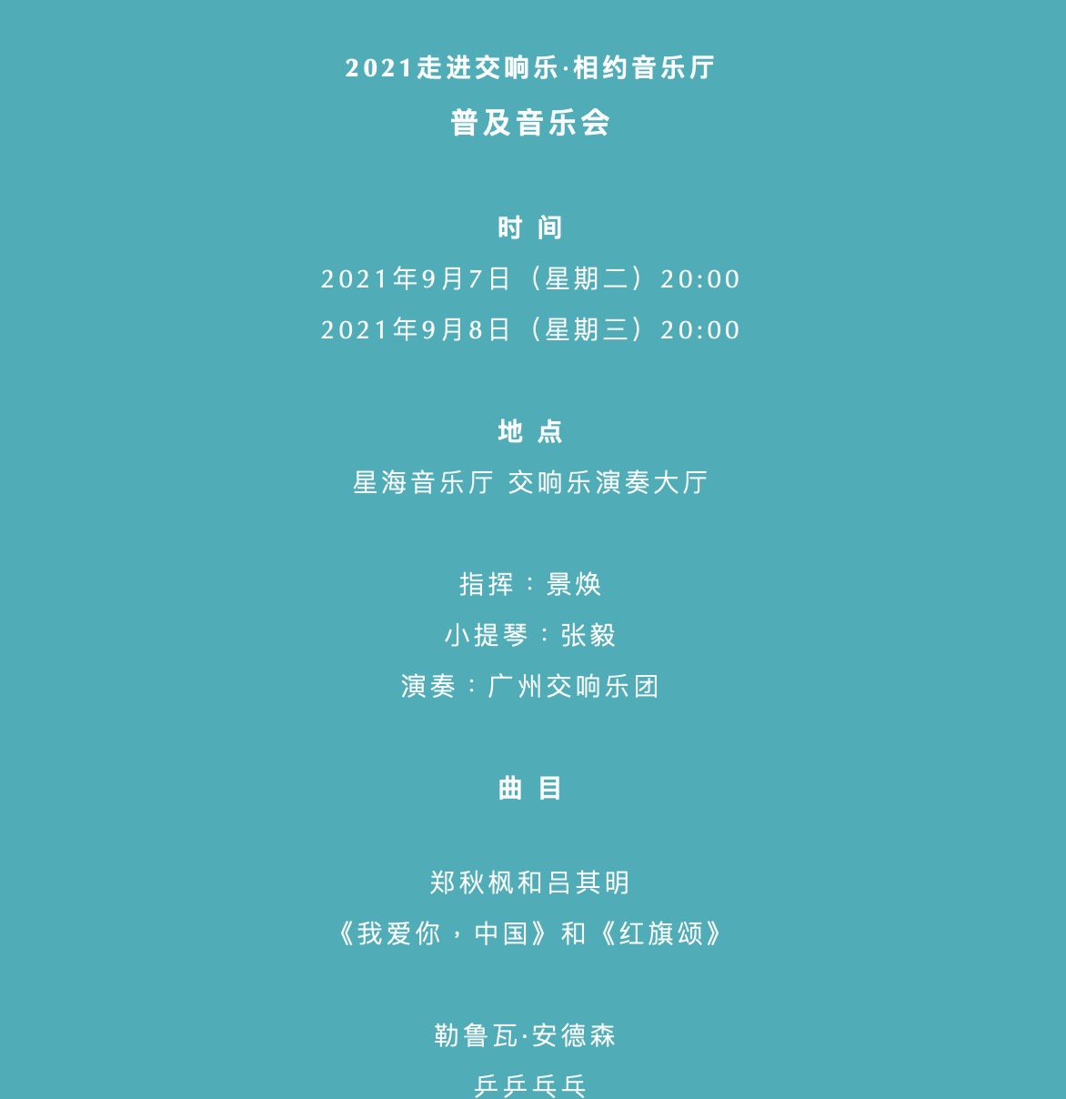 2021 “走进交响乐·相约音乐厅” 普及音乐会将于9月7日和8日举办。主办方广州交响乐团和星海音乐厅将定向邀请学生、市民、医护人员和 “音乐陪伴计划” 惠及的公益团体到场观看今年的普及音乐会。其中,9月8日音乐会为 “音乐陪伴计划” 慈善公益专场。