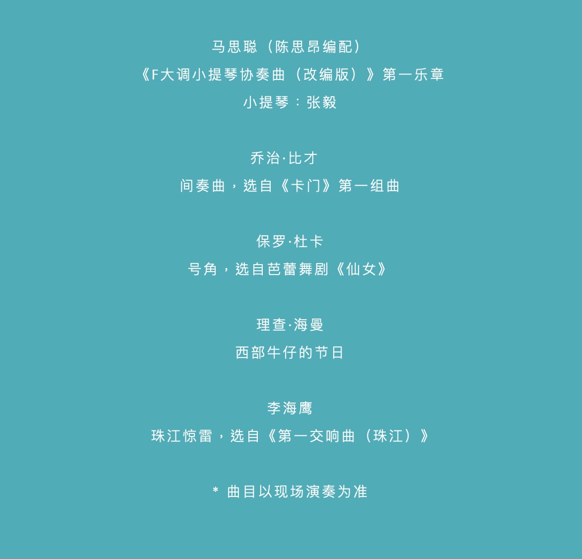 本场音乐会,主办方特意选取创作于不同年代的中国交响乐作品作为今年普及音乐会的曲目:从著名小提琴家、教育家马思聪先生在四十年代创作的《F大调小提琴协奏曲》、荣获 “七一勋章” 的作曲家吕其明先生在五十年代创作的《红旗颂》、广东作曲家郑秋枫先生在七十年代创作的《我爱你中国》,到2020年李海鹰先生创作的《第一交响曲(珠江)》(片段),展示了中国、尤其是广东作曲家如何用音乐来展现中华民族自强不息、砥砺奋进的峥嵘岁月,以此庆祝中国共产党成立100周年。