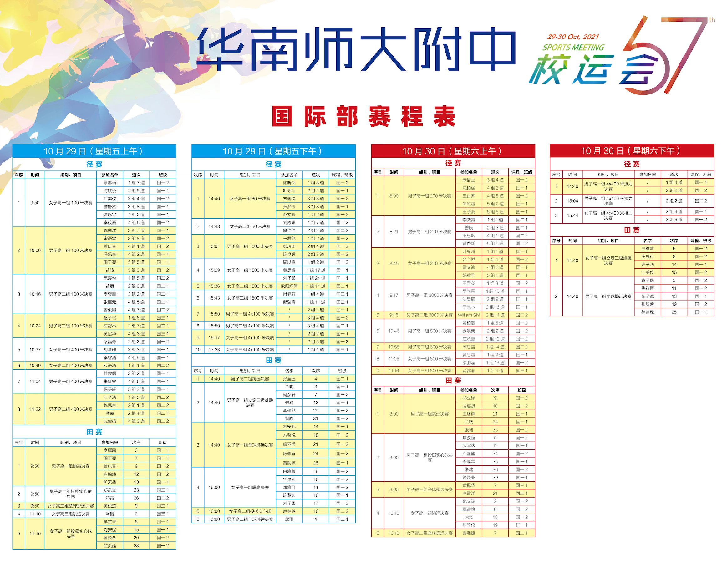 田赛检录点:西阶梯教室(体育馆门前),国际部Giver社志愿者提供协助;