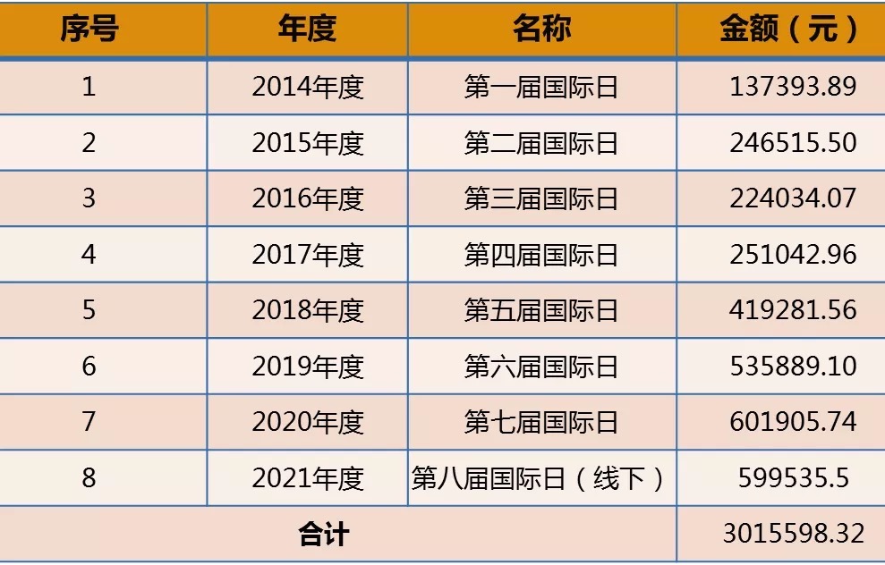 自2014年开始,华附国际部国际日慈善活动至今共举办八届,共筹集资金3015598.32元,定向用于市福利院养育设施设备改善、儿童功课辅导、孤残儿童养育等项目。