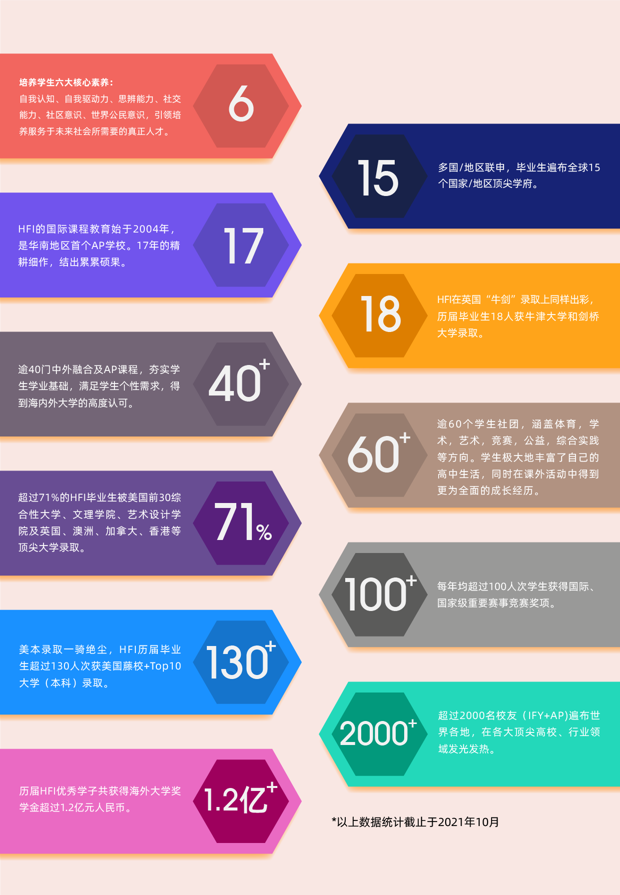 经过多年有序的办学实践,HFI毕业生在AP统考、SAT、TOEFL等国际考试中展现出不凡的实力;在海外升学方面也表现优异,HFI历届毕业生100%被世界名校录取,93%被美国排名前50的综合性大学录取,71%的同学被美国前30综合性大学、文理学院、艺术设计学院、加拿大及香港的名牌大学录取,20%的同学被美国前20综合性大学录取,一批优秀毕业生获普林斯顿大学、耶鲁大学、斯坦福大学、宾夕法尼亚大学(沃顿商学院)、哥伦比亚大学、芝加哥大学、杜克大学、布朗大学、达特茅斯学院、约翰霍普金斯大学、西北大学、康奈尔大学、加州大学伯克利分校、牛津大学、剑桥大学、墨尔本大学、清华大学等世界顶尖名校的录取。(详见《华附国际部2021海外大学录取报告》)