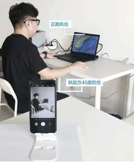 ● 手机支架或其他支撑物品,将智能手机固定摆放在电脑设备的侧后方45°的位置,手机离地高度1.5-2.0米,距离电脑屏幕1.5-2.0米。