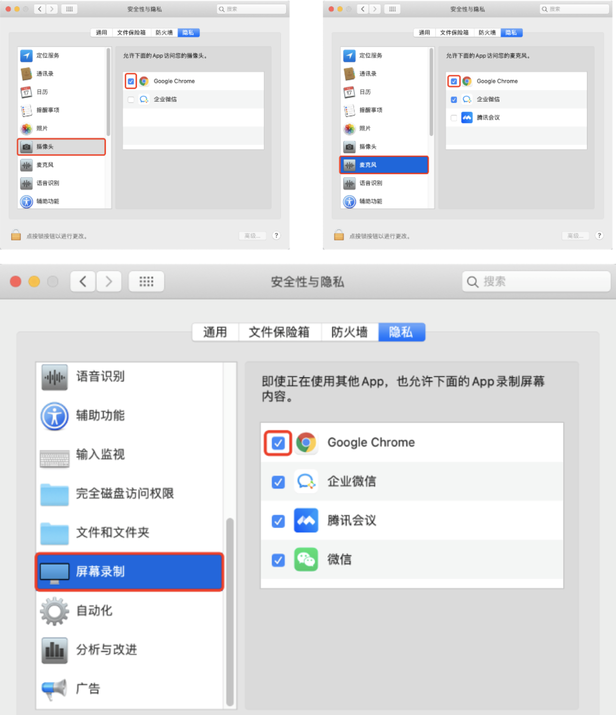 c. 电脑开机后,除谷歌浏览器外,关闭其他所有与考试无关的软件,避免意外干扰和软件弹窗影响考试;其中,苹果Mac OS系统,需提前在【系统偏好设置】—【安全性与隐私页面】,分别设置【摄像头】、【麦克风】和【屏幕录制】授权谷歌浏览器允许调用。