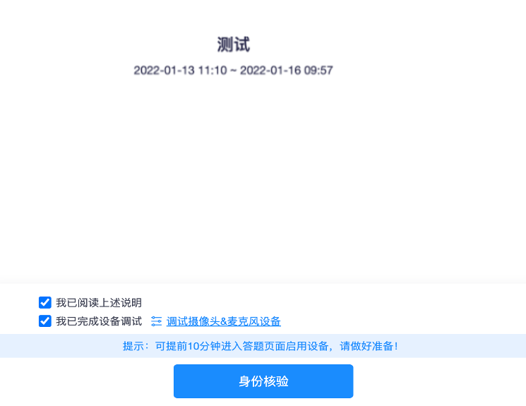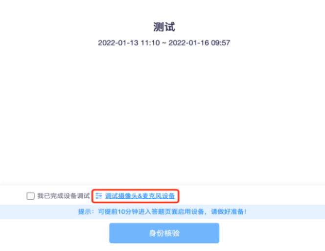 ● 回到考试说明首页,勾选【我已完成设备调试】,再点击下方【身份核验】按钮: