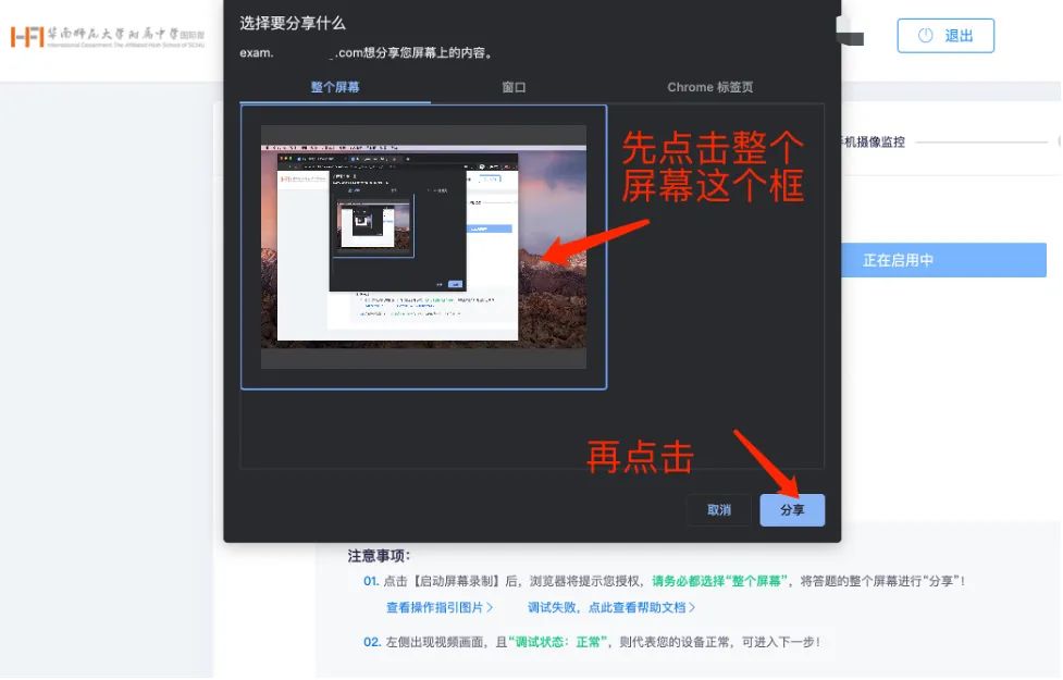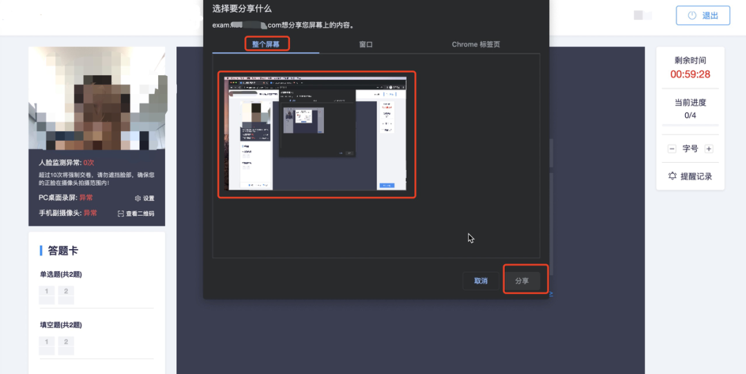 ●在弹出页面点击【整个屏幕】然后点击【分享】,进入作答页面。