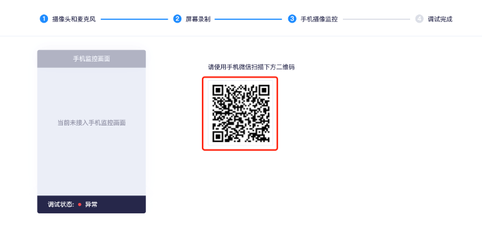 调试设备包括“允许使用摄像头&麦克风”、“启动全屏幕录制”、“设置手机监控”三个环节。