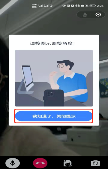 ● 使用监控手机,打开微信【扫一扫】扫描电脑屏幕上的二维码,然后调整手机摆放位置后(手机位置固定摆放后不可再触碰),点击手机上的【我知道了,关闭提示】: