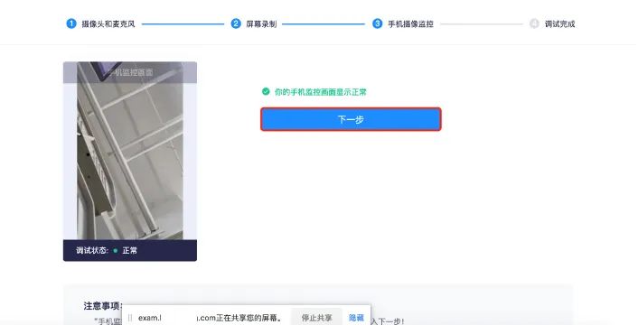 ● 手机监控调用成功后,回到电脑页面,点击【下一步】: