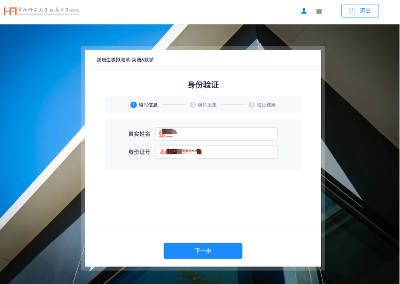 ● 核对考生【真实姓名】、【身份证号】,确认后点击【下一步】: