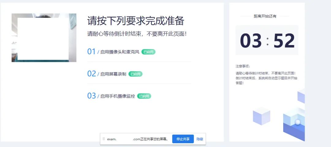 ● 如您提前进入考场,将会出现以下倒计时页面,请确保全部设备【已启动】。