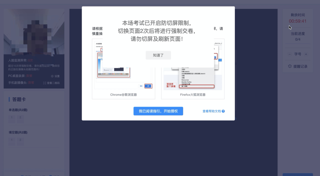 ● 正式进入考试界面,交卷倒计时启动,请认真阅读考试页面提示,然后点击【知道了】、【我已阅读指引,开始授权】。