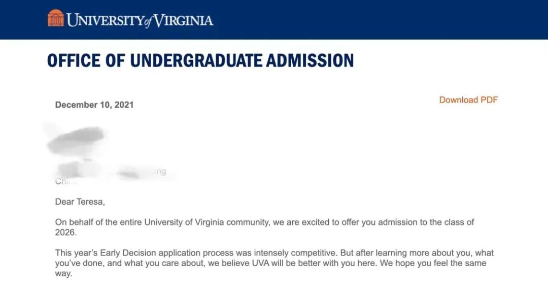 我是幸运的。12月10号那天我刚刚考完最后一次ACT,瘫在istudy的沙发上想着总算可以好好玩几天,紧接着就看到微信里的消息说UVA明天ED放榜。第二天早上我以为可以一觉睡到九点十点再起床查结果,结果妈妈一早就冲进我房间,说其他同学已经拿到offer了。