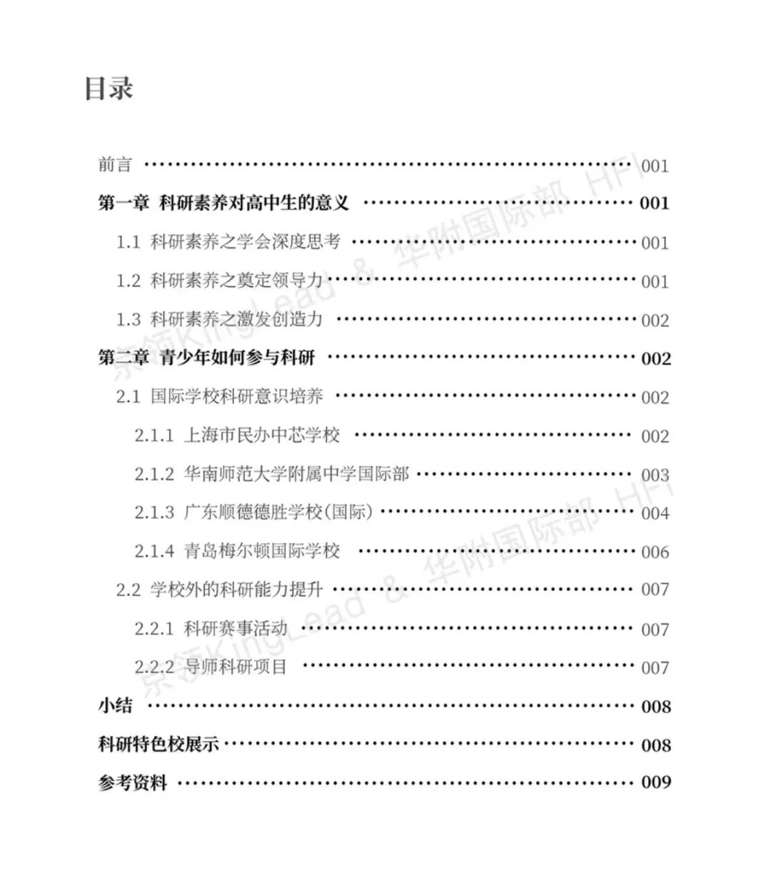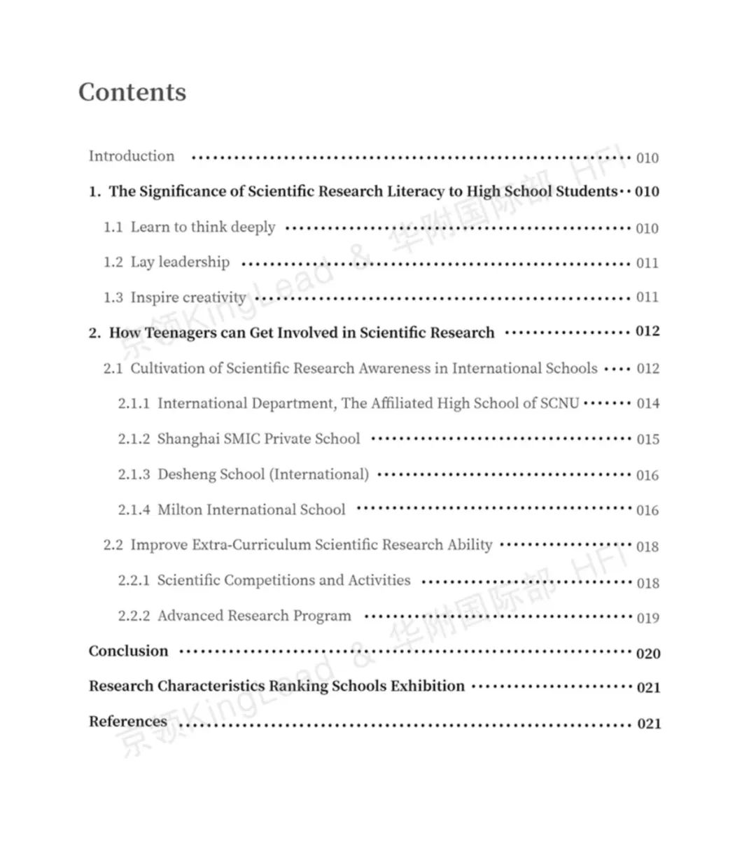 本报告共包含科研素养对高中生的意义、青少年如何参加科研、2022年京领国际学校特色榜·科研特色校展示三个章节。