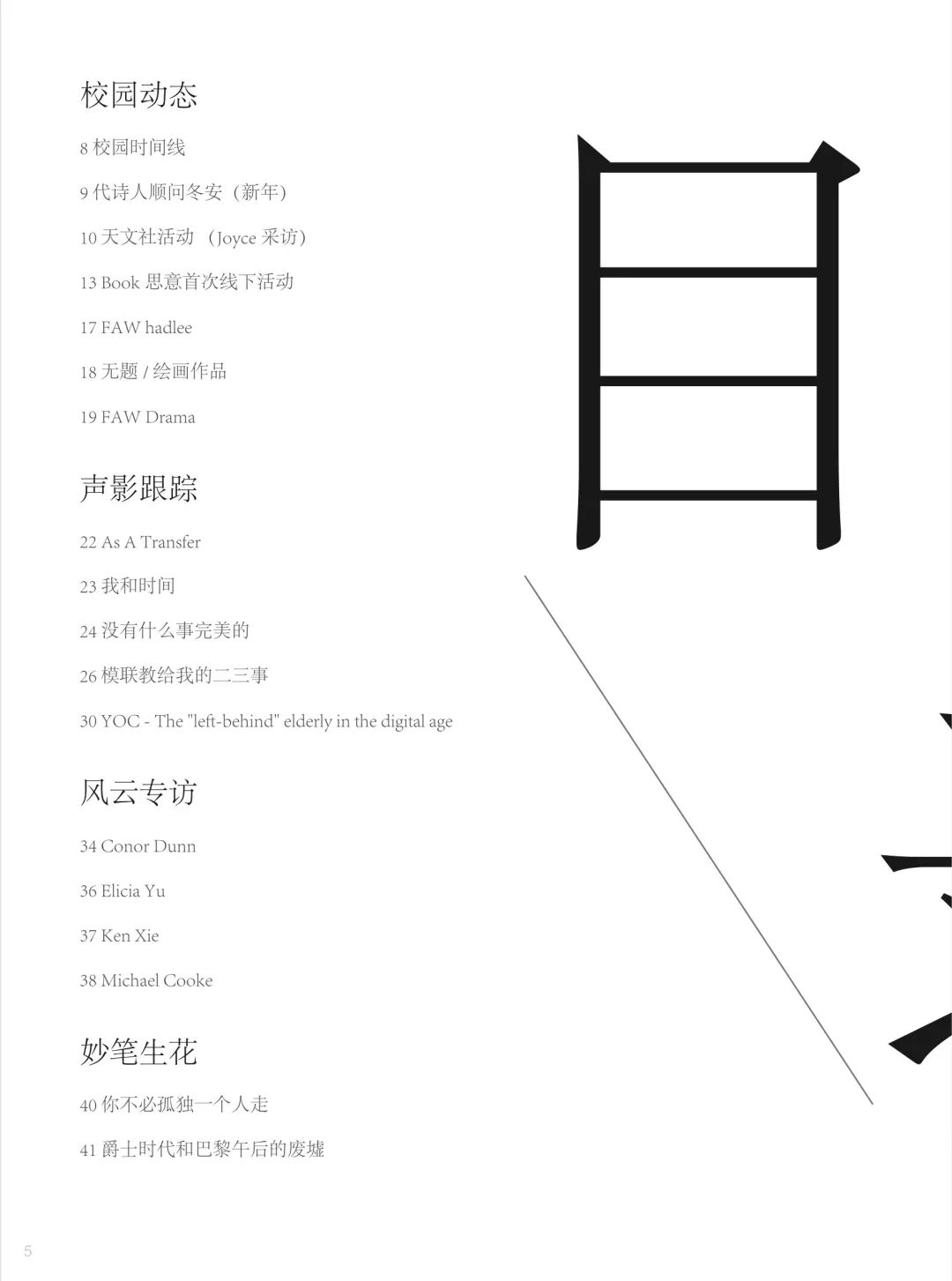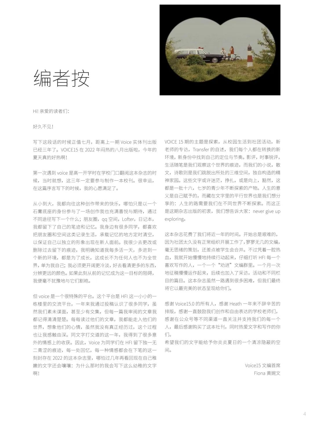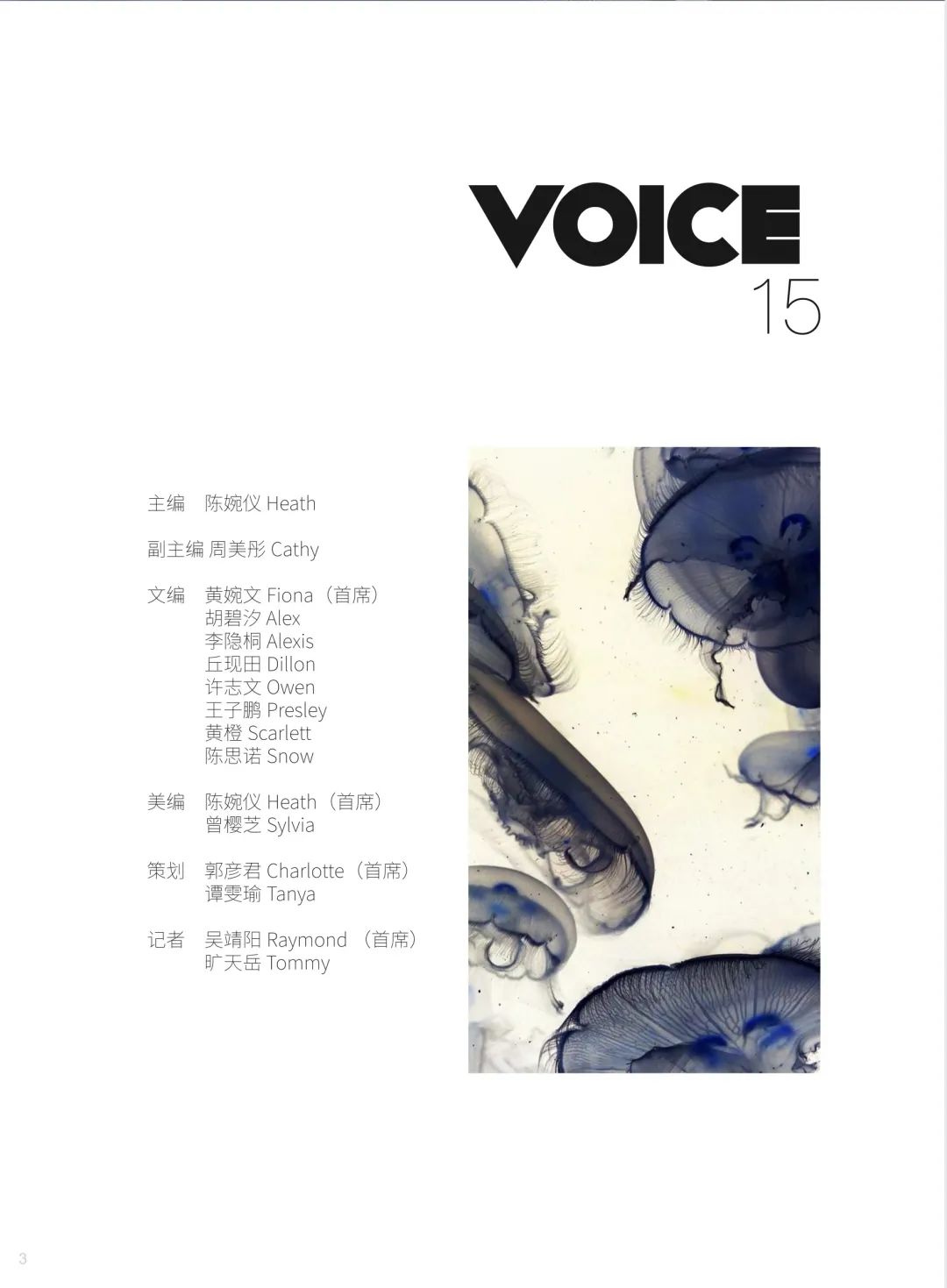 Voice15期是HFI VOICE校刊社的第15期社刊,时隔三年的第一本实体刊。这本杂志花费我们社员近一年的时间。这期的主题是“探索”,内容广泛,其中包含校园生活,从社团活动,新老师的专访,到Transfer的自述,优秀在校生的采访。其中更有学生创造性的小说,散文,诗歌,也不缺乏身为国际学生带有的批判性思维的影评,时事锐评,生活随笔。整本杂志采用精美彩打排版和印刷,共收录36篇文章,共124页。