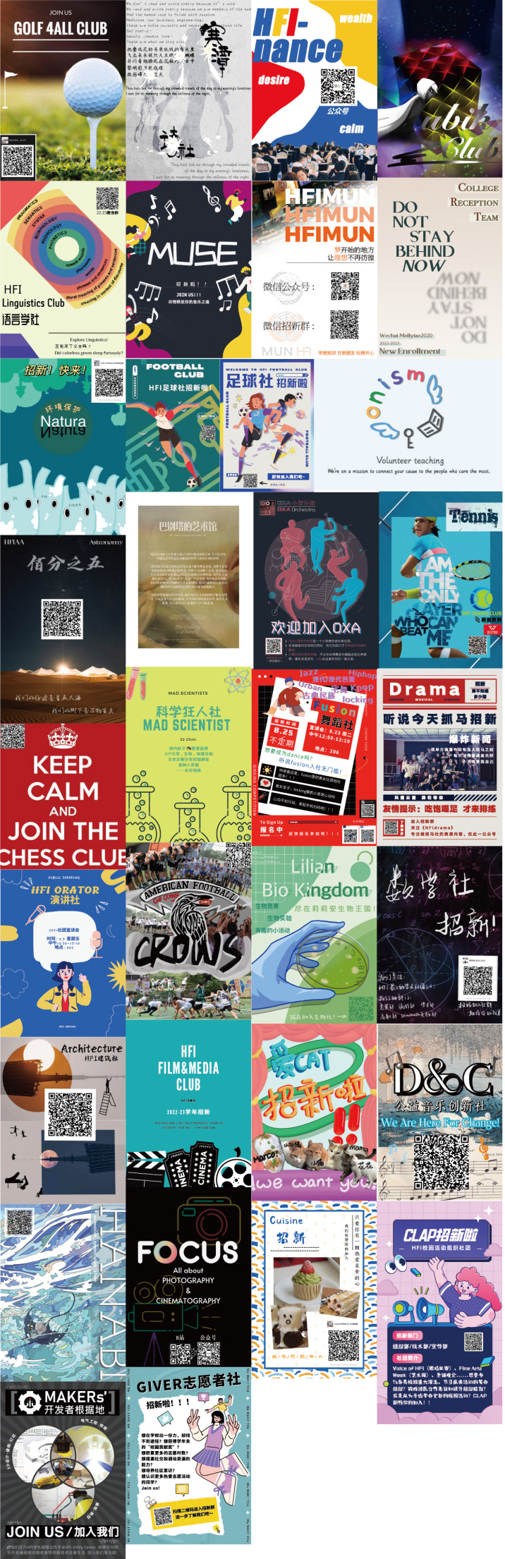 书法社、科学狂人社、篮球社、理心社、莉莉安生物王国、模联社、魔方社、排球社、烹饪社、乒乓球社、棋弈社、摄影社、神秘学社、数学社、天文社、网球社、舞蹈社、物理社、戏剧社、演讲社、羽毛球社、语言学社、国际棒球社、长跑社、志愿者社、足球社、环保社、C.L.A.P.、MUSE音乐社、Onism线上支教、OXA室内乐团、VOICE校刊社、阿卡贝拉、爱猫社、巴别塔的艺术馆、辩论社、创客开发社、电影社、橄榄球社、高尔夫球社、韩国文化社、花火社、建筑社、金融社、D&C音乐创新社