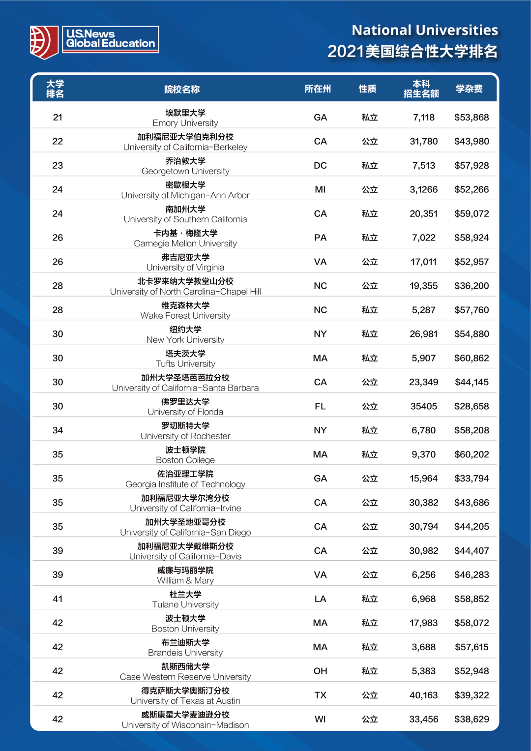 2020USNews全美最佳大学(综合性大学及文理学院)排名